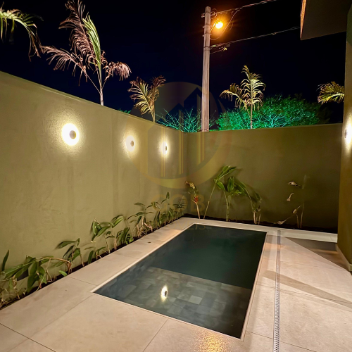 * Piscina privativa revestida com porcelanato PortobelloShop. Possui prainha, hidromassagem, aquecimento solar e iluminação