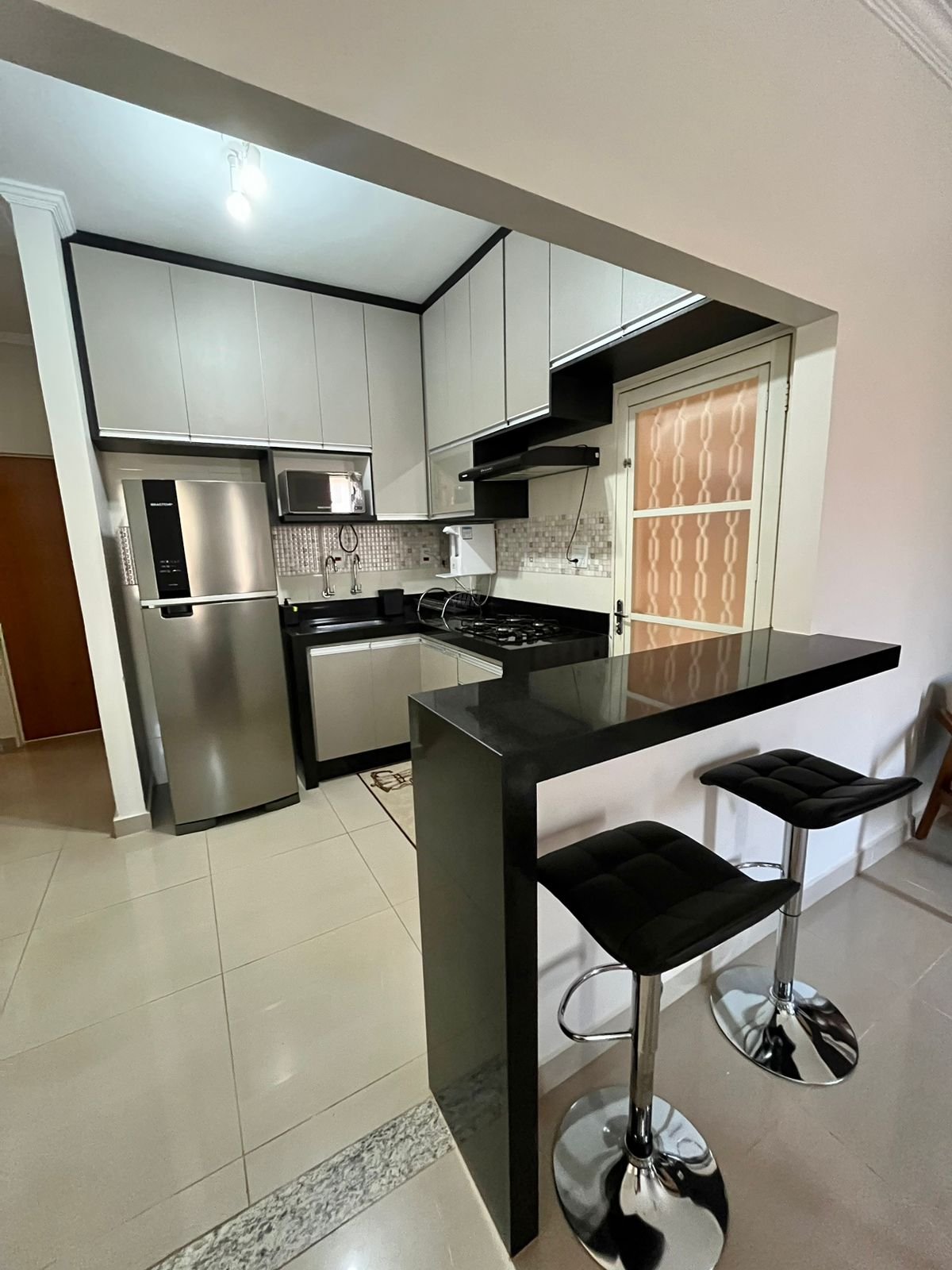 – Cozinha americana planejada com armários, balcão e fogão cooktop;