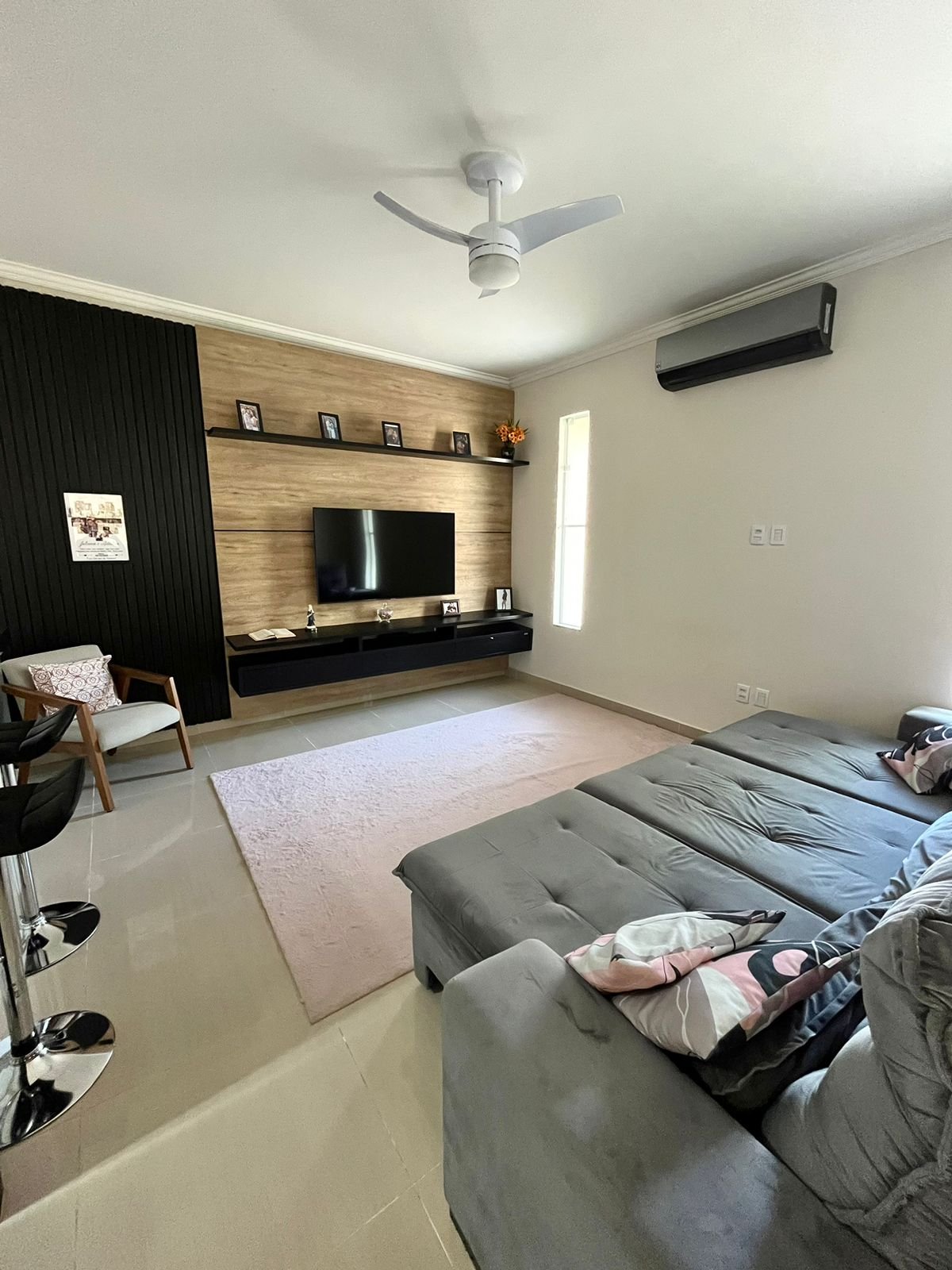 – Sala ampla com painel de tv de madeira ripado e ar condicionado;