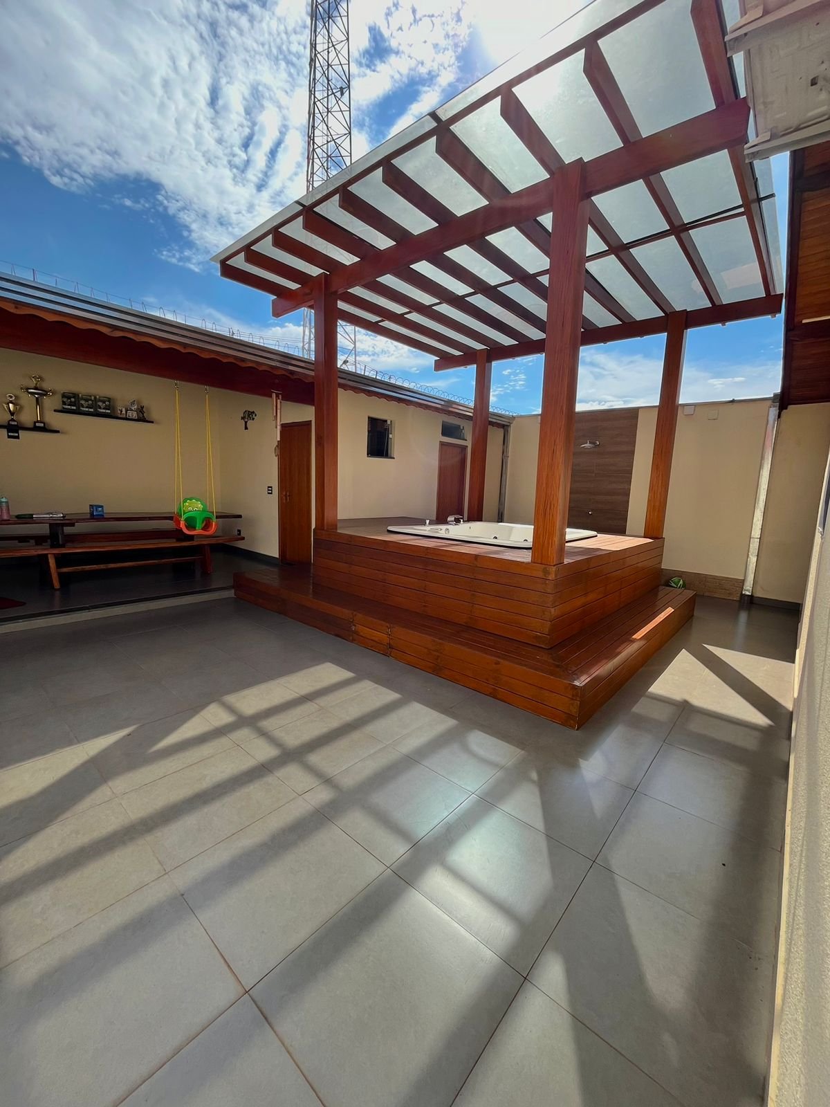 – Banheira SPA coberta com pergolato de madeira coberto com vidro;
