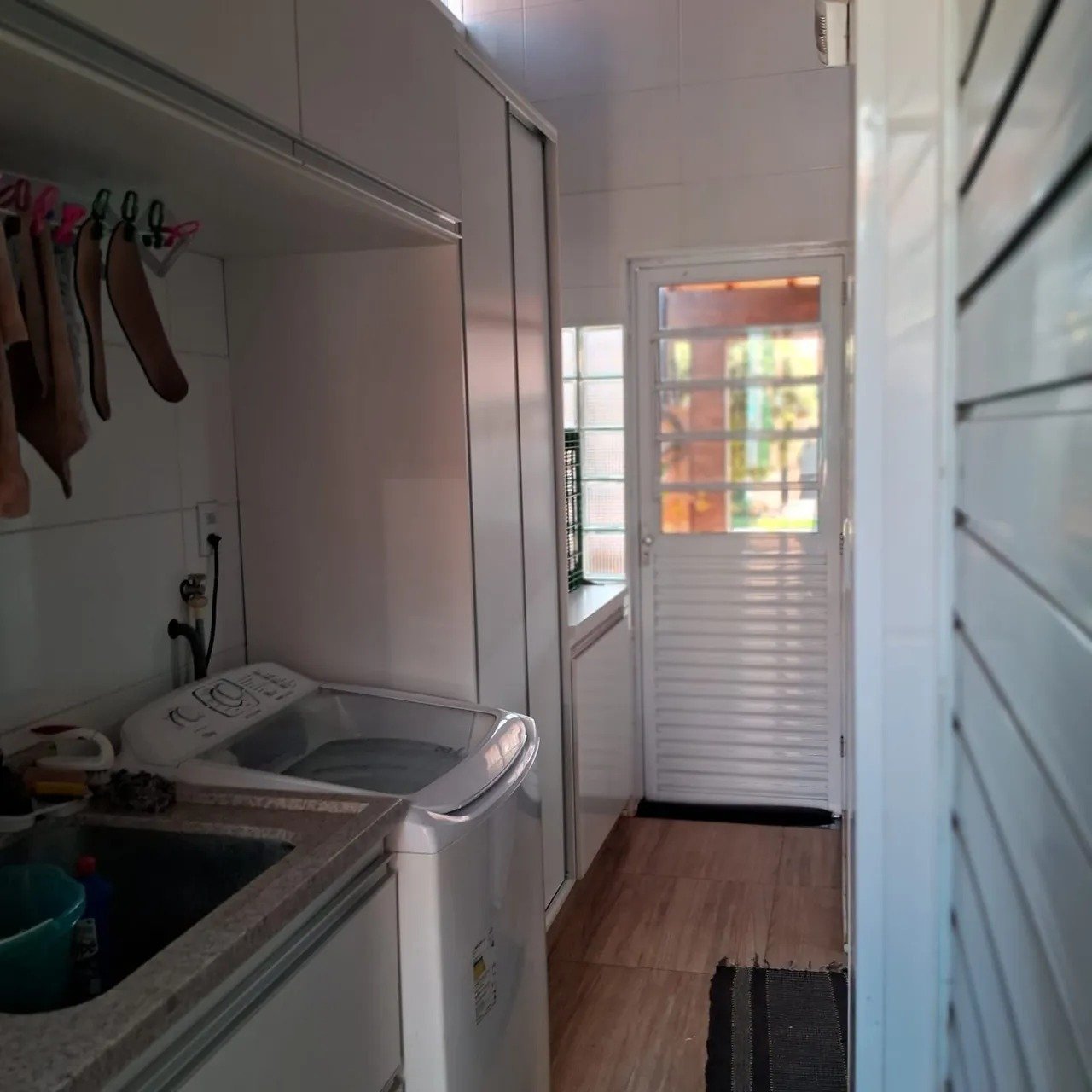 – No corredor externo tem porta de vidro de correr com trava separando a lavanderia da área gourmet.