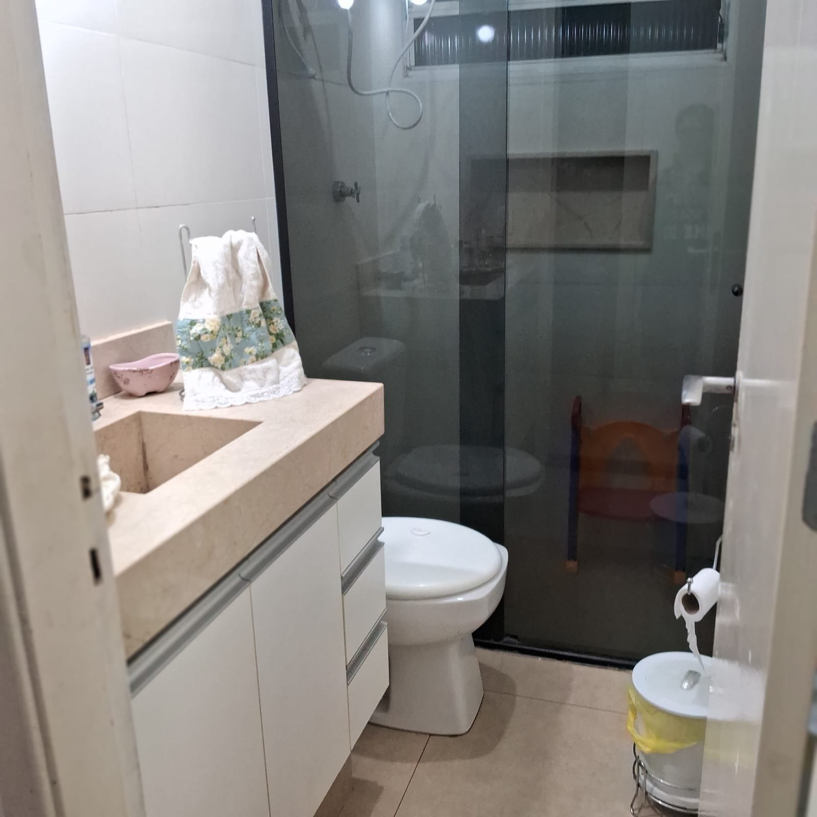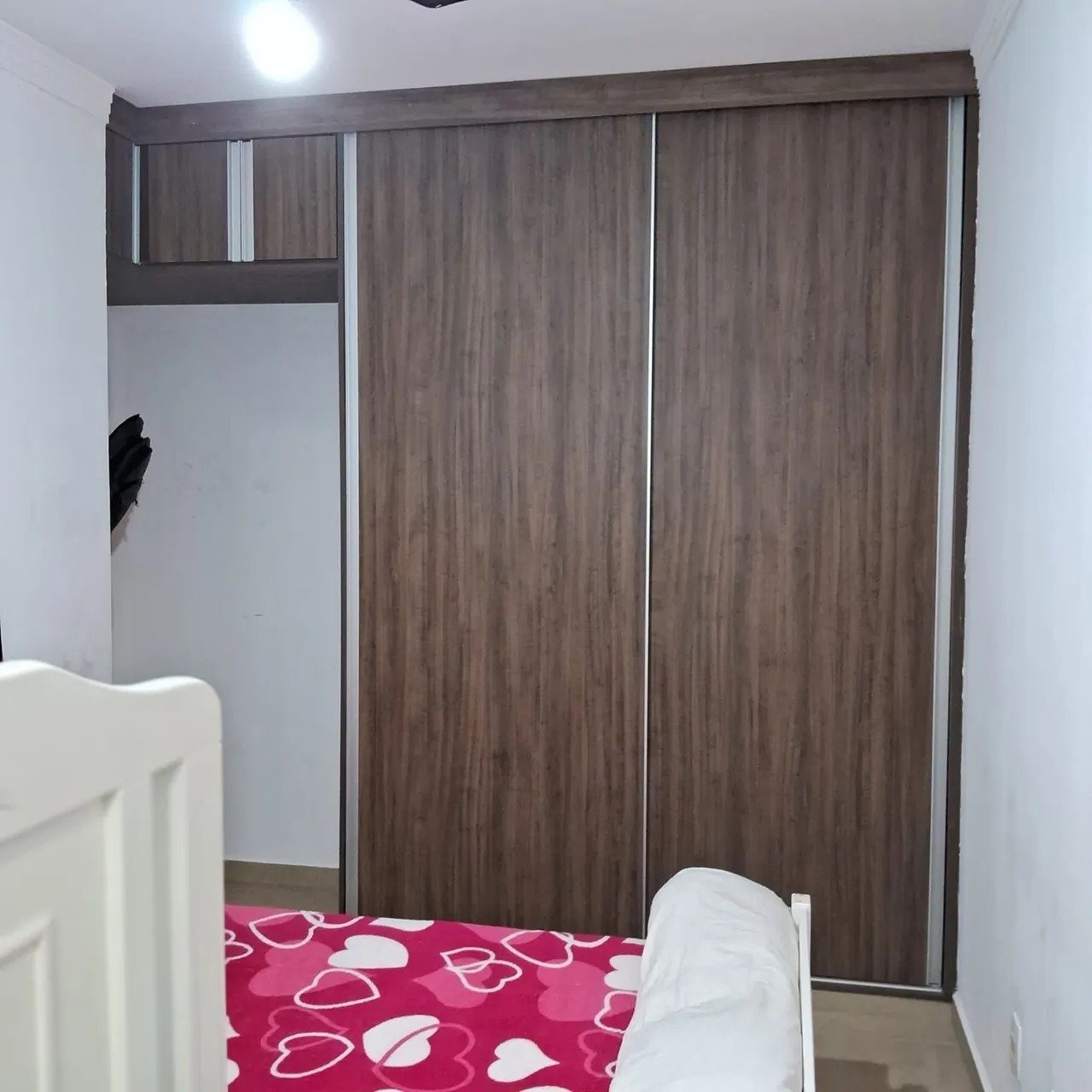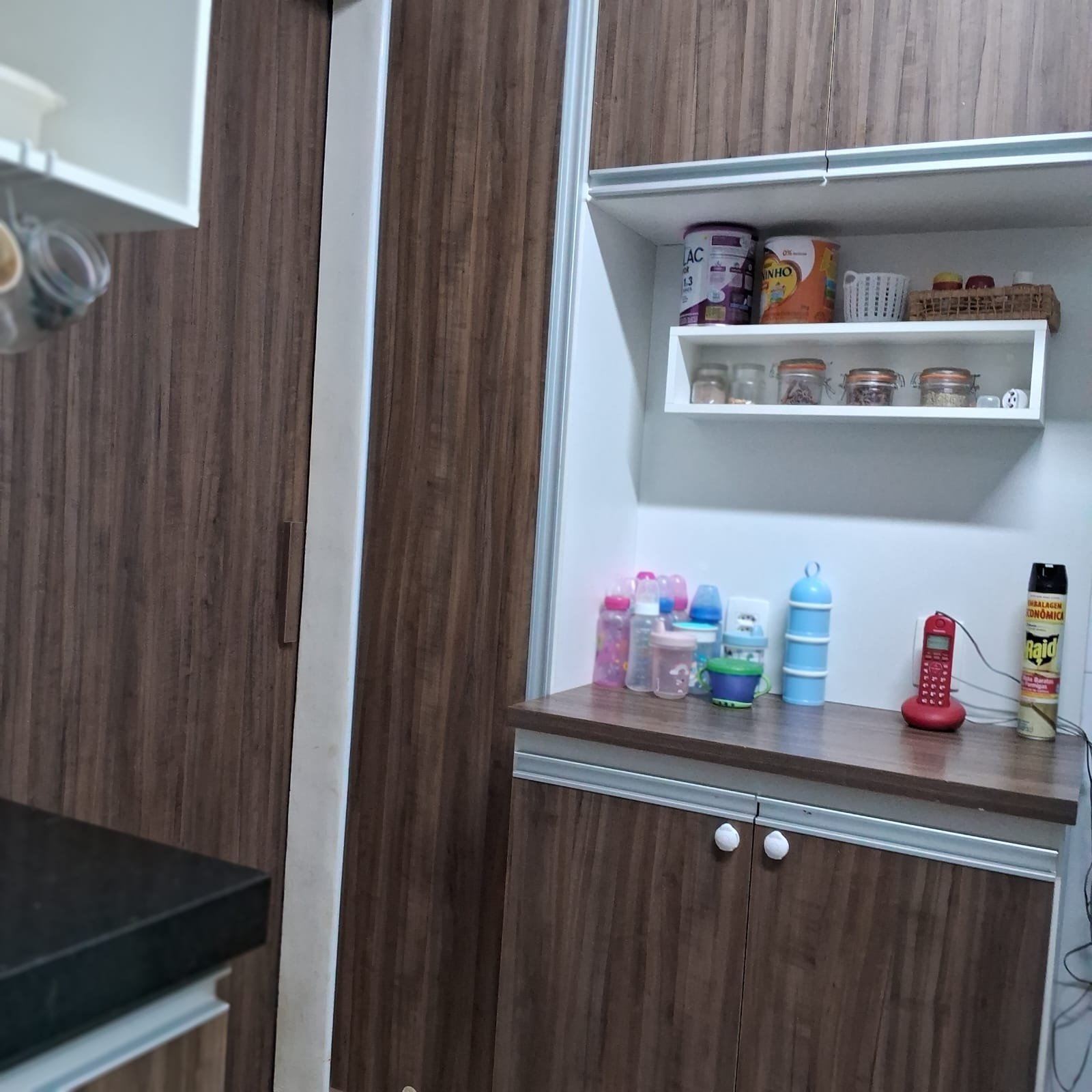 – Na sala 2 ambientes há painel de mdf com cristaleira suspensa, luzes de led e 2 portas de correr para isolamento da cozinha e dos quartos.