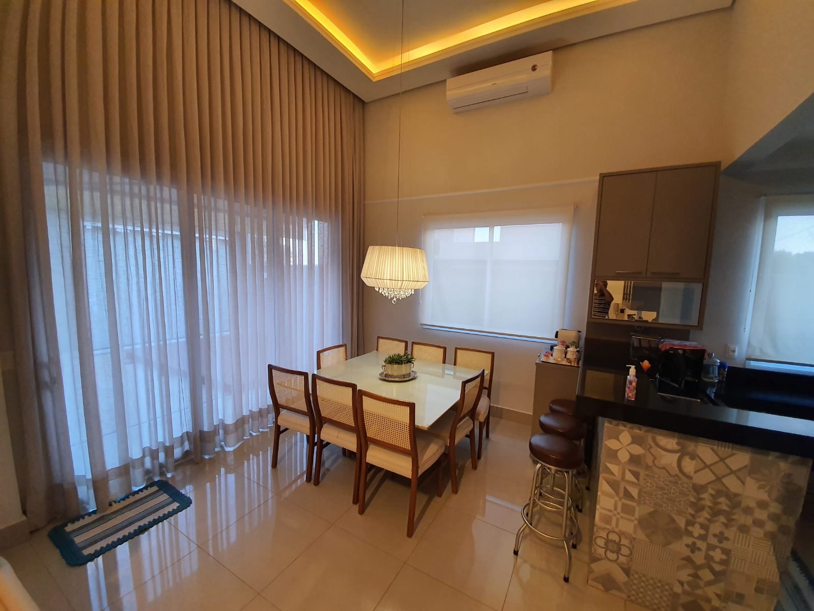 Possui Hall de entrada, que liga com a sala principal, ampla e aberta, com pé direito alto de aproximadamente 5m, com TV e sala de jantar e cozinha americana, incluindo dispensa e uma grande cristaleira.